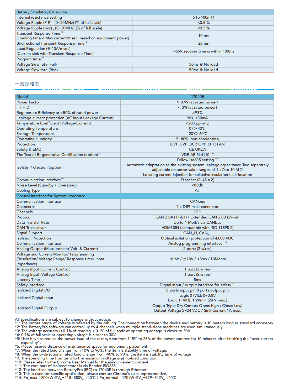 Chroma 17040E电池模组测试系统是专为高功率二次电池组测试而开发的高精密充放电设备,具有能源回收功能,可节省放电过程所消耗的大量电能,即使动态充放电,也能确保电网端维持稳定,不致因谐波污染影响其他设备。